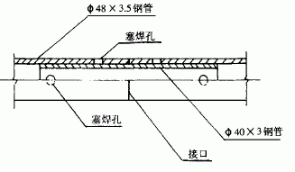 0•1mm以内。第1节支承杆的长度分别为3m、4m、5m和6m长,并相间交错布置,滑升时接长的支承杆均为6m长。支承杆接头采用插入一节长150mm的40×3mm短钢管、通过在支承杆每个端头钻出的径向相互垂直的4个10孔与之塞焊固定(见图3)。所有接头焊接都要在接头未通过千斤顶以前完成,并用手持砂轮机把凸出钻孔的焊包打磨平。