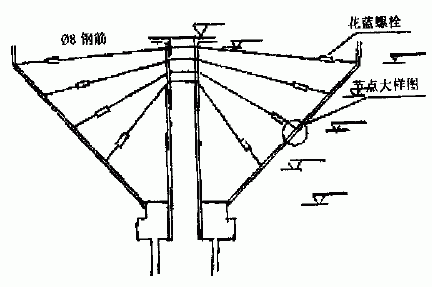 原计划水箱施工采用液压提升工艺:将水箱围绕筒身就地预制,按吊重1150 kN,选择80台HQ-35型千斤顶,采用倒置穿心千斤顶提升法提升就位或8台YQ-50型千斤顶,周边设24根Φ25 mm吊杆在筒顶安装钢作业平台及提升支架,将水箱提至筒身顶面标高29.4 m处,经抄平找正捍接固定于钢支架上,接着浇灌中间悬挑钢筋砼环板,将水塔上下连成整体。虽然此工艺先进,但需解决提升设备,制作钢平台、支架及液压系统等。水塔只有一个,施工完后,平台、支架等周转材料全部废弃,一次性费用过高,经过考察论证,设想在高空吊模,先施工水箱中的人孔井,利用人孔井作支承,向四周分四层呈辐射状,引吊索,提吊水箱外模结构,改预制水箱为高空现浇水箱(见图2)。