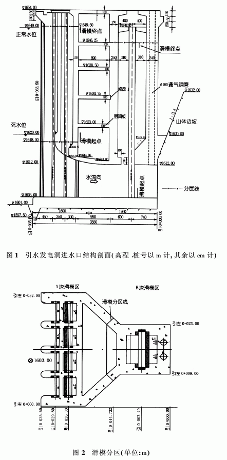 引水发电洞进水塔的结构体型在一定高程范围内变化较小,符合滑模施工要求。对滑模施工和常规模板施工两种方案进行了比较,结合本工程工期紧、任务重的特点,在充分考虑施工安全、质量、进度要求基础上,确定主要使用滑模施工,对于底板及胸墙以下结构尺寸变化大的部位采用常规模板施工。