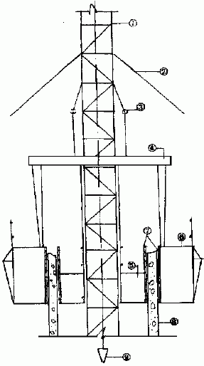 ①内井架②缆风③提升用葫芦④滑模提升架⑤内操作平台⑥外操作平台⑦支筒内外模板