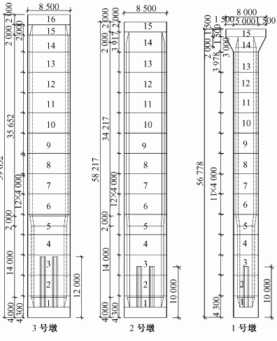 苏通大桥主桥基础主1~3号墩墩身均采用钢筋混凝土分离式矩形薄壁墩,单幅桥墩平面尺寸均为8•5m×5•0m。但主1号墩因支座布置等构造需要,墩顶设置T形墩帽,其平面尺寸为8•5m×8•0m,高4•5m,如图1所示。根据墩身构造特点和对外观质量、安全质量的要求,经多种工艺比选,采用目前国内外工艺最先进、自动化程度最高、结构最可靠的液压爬模施工技术施工。