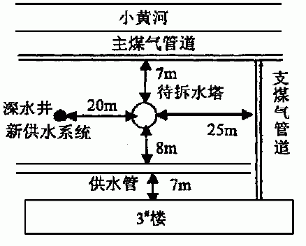 邢台矿业集团大型供水塔因扩建需要拆除。该水塔地处邢矿集团家属区,环境十分复杂(图1),水塔东侧25 m处为邢矿集团家属区支煤气管道;南侧8 m为3#楼供水管,15m处为3#住宅楼;西侧20 m为深水井及新供水系统;北侧7 m为邢台市主煤气管道。水塔为砖混结构,见图2。自下而上每5m一个钢筋混凝土圈梁,全高36 m,其中水箱高11.8 m,容积300 m3,质量285.8 t;筒体外径7 m,壁厚18 m以下为50 cm,18 m~24.2 m为37 cm,质量461.4 t。水塔建于1982年,结构完整,没有任何破坏风化痕迹,其内部有通往顶部的悬梯。