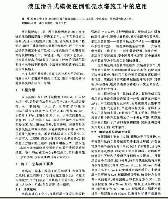 液压滑升式模板在倒锥壳水塔施工中的应用